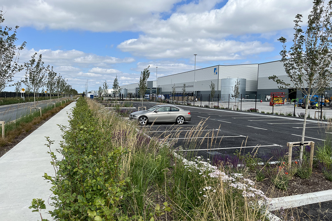 CSR were appointed as Landscape Architects for a commercial logistics development in Baldonnell, with a brief to create a cohesive campus landscape linked by a strong Green Infrastructure Strategy. The design needed to provide a network of connected footpaths, a unified materials palette and biodiverse, low-maintenance planting. A key requirement was the incorporation of a catchment-scale flood relief system for the Camac River, addressing both river and on-site flooding. This was achieved through a significant interconnected network of swales and basins that manage overground flows and improve the site’s climate resilience.